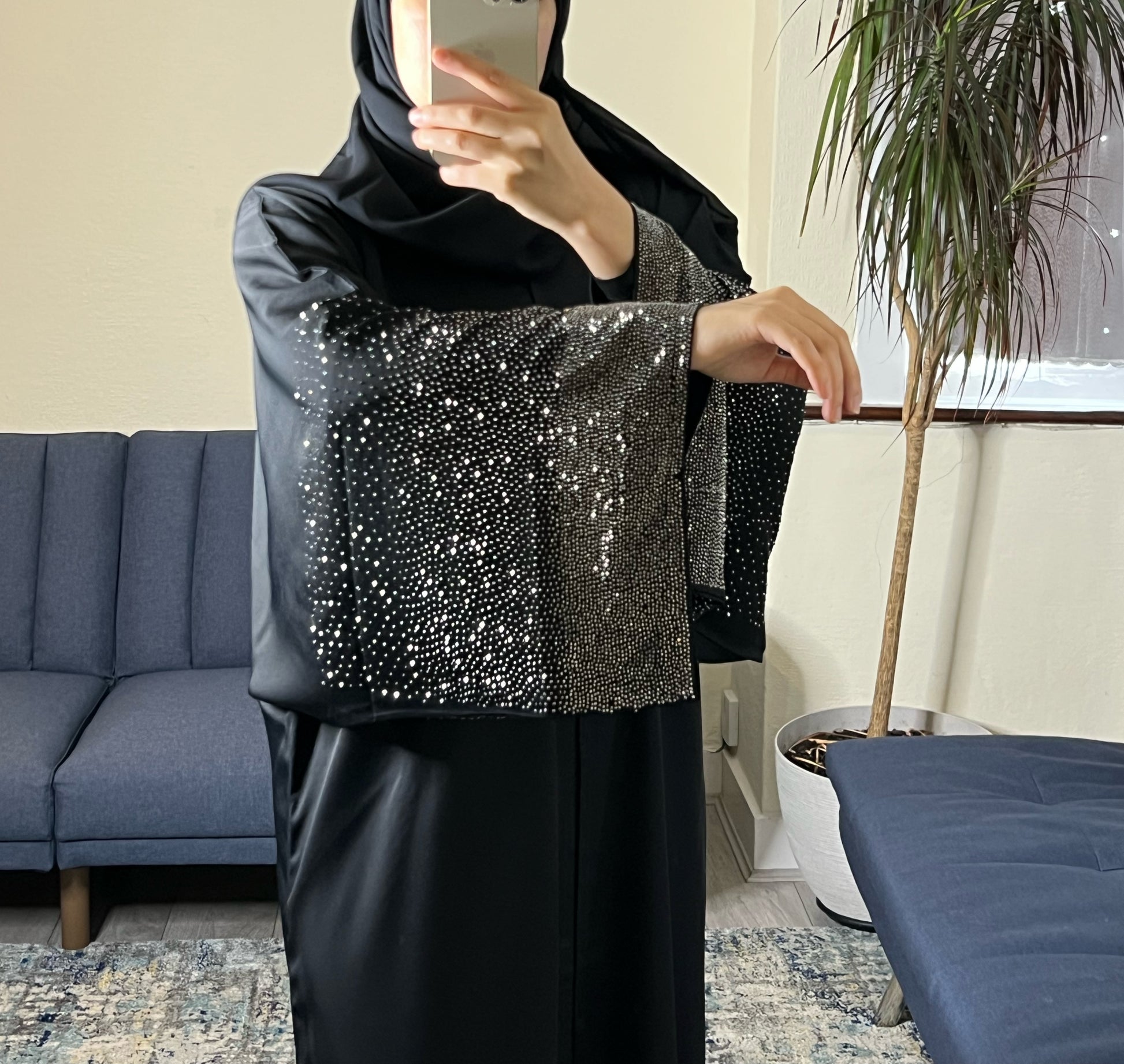 Elegant black abaya featuring stunning silver sequin detailing on the sleeves. Made from premium Nida fabric with a relaxed, comfortable fit. The eye-catching sequin panels on both sleeves add glamour and sparkle, making this perfect for weddings, Eid celebrations, and special occasions. Pair with a simple black hijab for a sophisticated evening look.