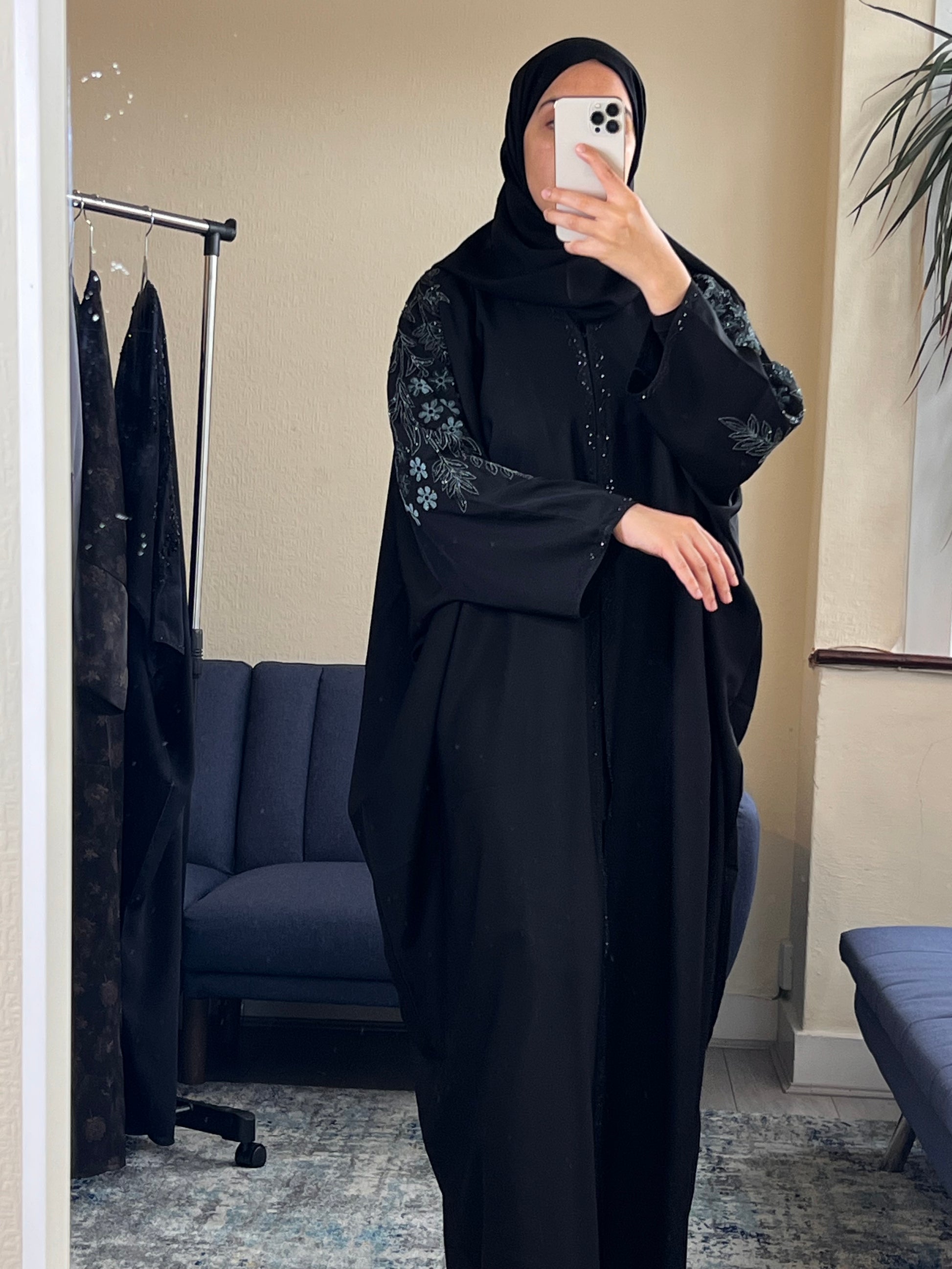Luxurious black batwing abaya featuring exquisite floral embroidery along the sleeves and shoulders. The elegant batwing silhouette offers a flowing, graceful drape while the intricate embellishments and subtle sparkle details add sophistication. Crafted from premium Nida fabric, this piece combines comfort with modest elegance, perfect for special occasions and evening events.